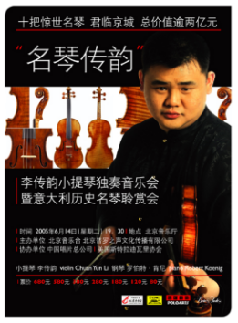 2005年6月14日,李传韵首次站在北京音乐厅舞台上,用特拉迪瓦里世界顶级名琴揭开中国音乐历史的新篇章。这次独奏音乐会,李传韵使用的名琴是美国斯特拉迪瓦里名琴协会主席富什为他长期提供的意大利名琴,著名大师瓜奈里·道·吉苏于1730年在意大利克里莫纳制作,总价值逾2500万美元,相当于2亿元人民币的意大利名琴。
