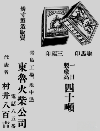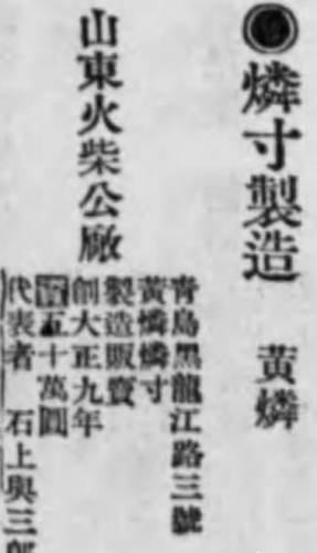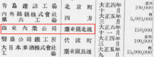 实际上,从零星的资料还能发现山东火柴公司以“台东镇北通”为地址的记录。继山东火柴和青岛燐寸两家日资火柴厂开工后,以小林吉右卫门和村井八百吉为投资人的东鲁燐寸株式会社在山东火柴的东北侧设立,两家是沿街相望的近邻。