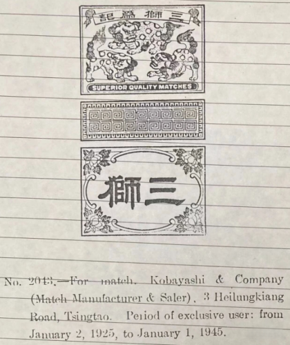 编号2043的商标资料显示,作为火柴生产商和销售商的小林株式会社(Kobayashi & Company),地址在青岛(Tsingtao)黑龙江路3号(3 Heilungkiang Road)。已获注册的“三狮”商标,授权独家使用的有效期是从1925年1月2日至1945年1月1日。