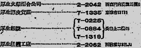 1935年出版的《交通部北平电话局号簿》,有一家“厚生工厂”登记在册。电话“西二〇六二”,地址“西直门内大街”。在1936年的“号簿”中,除了厚生工厂的地址具体为西直门内大街123号之外,还有“厚生火柴两合公司”在列。