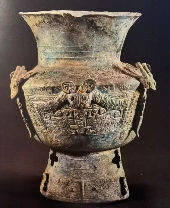 这是一件伏羲女娲同体玉雕。看官,明明只是一个蛇身人头玉雕,你怎么说这是“伏羲女娲同体玉雕”呢?关键说明在于它戴的冠子。这种冠子是模拟两条龙蛇之躯,它象征着伏羲女娲两条龙图腾的身躯,这说明此冠子的初创,已经是帝舜氏时代以后的事情。据《尚书·尧典》记载,黄帝的后人帝尧氏,将自己的女儿娥皇、女英嫁给了帝舜,生了三身国。也就是说,三身国的诞生在夏朝以前,可能在帝舜氏没有政变帝尧氏以前吧。《山海经》说娥皇、女英嫁给了帝俊,而实际上是嫁给了帝舜。显然这是后世人冠前世人名字的现象。这种现象一是因后世子孙的名声很大,记录者干脆让后世人的名声代替了前世人,二是因帝舜的“舜”和“俊”同音,记录者有意让他们形成同名现象,以壮他们的声威。所谓的“三身国”,按照三星堆出土的“龙虎尊”图像来看(图2),就是两条图腾龙(虎形龙)生了一个具有炎帝、黄帝共有血缘的人形后代(这个图像,过去往往叫“虎食人”)。