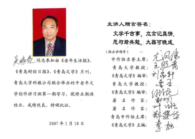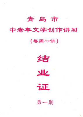 首先想到的是我曾经是青岛市中老年文学创作讲习班的参与者(有结业证书为凭,附后)。对长我五岁的王照青大哥和大我十六岁的刘禹轩大姐夫略知一二;对协助办班的付玉秋、马承芬女士和经常应聘到班授课的鲁原、尤凤伟、刘禹轩、徐培范、柳士同、马含芳、郑建华、王桂云等人也不陌生。