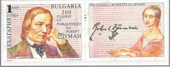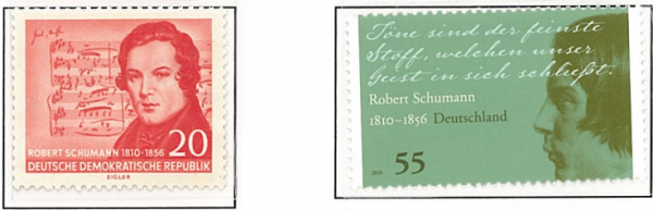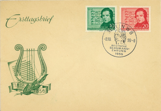 东德,1956,舒曼与歌曲《月夜》曲谱首日封,所贴邮票为错版(曲谱为舒伯特所作),盖舒曼像首日戳