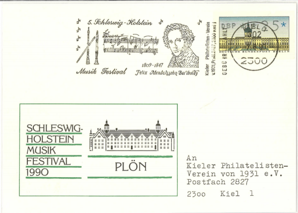 德国,1990,电子邮票实寄封,基尔市寄本埠,销基尔市邮戳,加盖基尔集邮协会宣传戳,文费利克斯·门德尔松