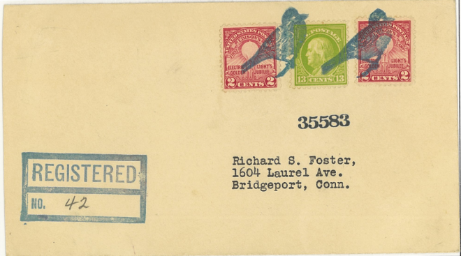 美国,1933,花式邮戳销票挂号实寄封,自Finch寄 Bridgeport,销两款云雀图花式邮戳,左下角销挂号戳,背销寄落戳