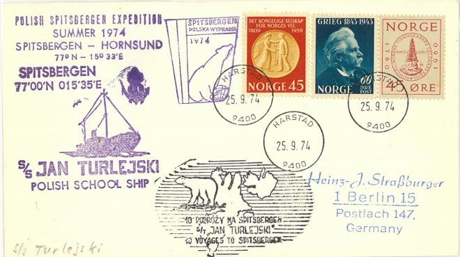 格里格享有很高的声誉,也是少数具有极强旋律天赋的作曲家之一,波兰与挪威联合“北极斯匹次卑尔根岛”探险船JANTURLEJSKI号搭载邮件,挪威北极邮局寄德国柏林,1974,贴挪挪威皇家农学会150周年1枚+挪威社会学创立200周年1枚+作曲家格里格1枚,盖北极邮局日戳,盖探险宣传副戳