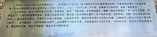 最近在美术馆参观时,发觉这处文保碑的底部,还有一块长条状不锈钢的文字介绍。开头一句的“万字会(原名世界红卍字会青岛分会)”,看似是对石碑做出了补充的精确解释,但这种表述在某种程度上又是对公众的误导。