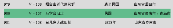 据“国发〔2006〕19号”的《国务院关于核定并公布第六批全国重点文物保护单位的通知》,在第五部分的“近现代重要史迹及代表性建筑(共计206处)”的名单中,以序号980、编号V-107、单位名称“万字会旧址”、时代“民国”所依次排列的基本信息中,最后的地址一栏还是“山东省济南市、青岛市”。由此可知,同样的“万字会旧址”,分列济青两地。