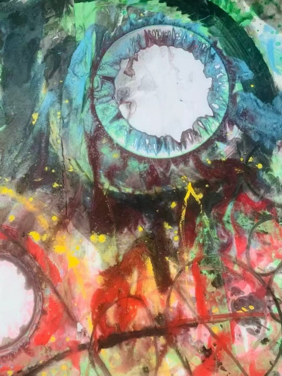 在结构线条上,“蓝眼”居于中上方,其圆形轮廓作为主导线条,在画面中层层递进、逐渐浮现、彼此衔接,传递出人眼渴望“洞悉清晰”的内在诉求。然而,这一核心意象又被精心地重新嵌入充满不确定性与混沌的现实背景之中,巧妙地暗示了观察主体与真相之间的永恒距离,最终在混沌中实现了“主”与“次”、“显”与“隐”的视觉平衡。