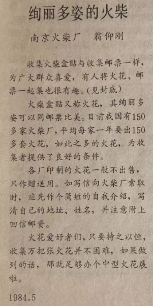 短短二百多字,把火花和邮票连在一起。当八十年代的全民学习、积极向上逐渐成为热潮时,一个大众收藏的时段也已经开启。物质生活水平的相对偏低,使得其时的收藏活动非常纯真。正如作者所言,火花的由来直接给火柴厂写信即可获取。