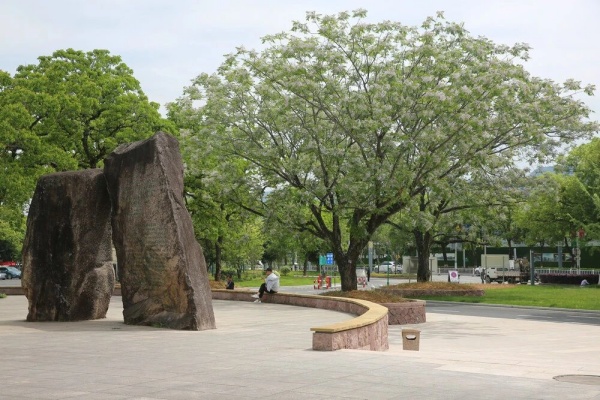 人字石与苦楝、乌桕、重阳木、枫杨、香樟和活水溪、稻花鱼、松鼠、茶园组成武夷山国家公园北入口风景。多年风吹雨淋,石头风化为黑褐色,背面的绿字也模糊了。稍大一块胸前挂“世界遗产”长方形牌子,稍小的挂“中国国家风景名胜区”圆牌。人字石的一撇为山,一捺为水,山水支撑而成金山银水,为当地造了不少福,单门票一项收入便很可观。