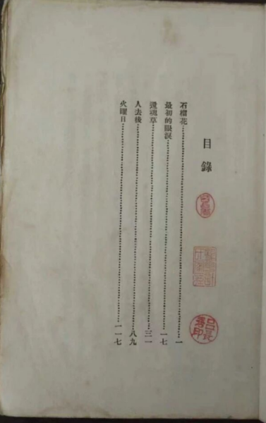 作品本身的不很成熟,作者有意地掩弃,再加上数十年的战乱相仍,《石榴花》在天壤间的存量,可能寥寥无几。前些时偶翻《怀乡集》,看了自序中的那几句话,忽然想起家里残存的老书之一《石榴花》,意识到这正是《怀乡集》之前,那本“被人忘记的小册子”。此书是祖母早年的读物,历经八十余年的世事沧桑,保存尚好。封面的右侧画了一枝简笔石榴,红花绿叶,左下角是红色的仿宋体书名、作者名,从右向左横排,天地各有一道黑线,版权页印着“一九二八年九月出版”,“第一线书店”等字,印花处空着,不知是失落了,还是干脆就没贴。第一线书店是1928年8月,刘呐鸥约施蛰存、戴望舒成立的一个私营出版社,因为出《无轨列车》杂志,只两个月就被查封。