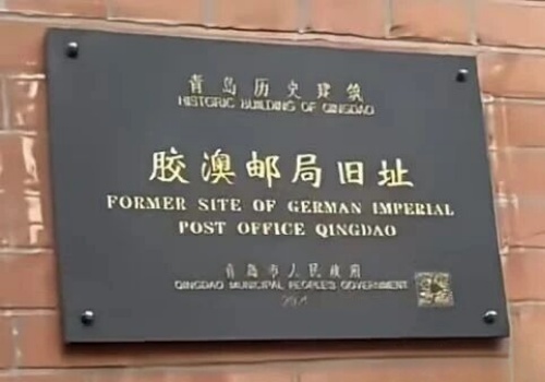 与“德国胶州”牌子对称的是,大门右侧还有一块以“青岛历史建筑”为标记,2021年青岛市人民政府落款的“胶澳邮局旧址”铭牌。从对应的英文可以看出,它包含了“德国帝国”的历史属性。