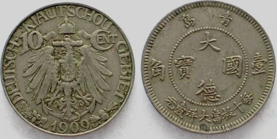 “大德国宝”壹角的硬币,图案面的德文DEUTSCH KIAUTSCHOU GEBIET即“德国胶州领土”,对应正面直接显示的发行地“青岛”。