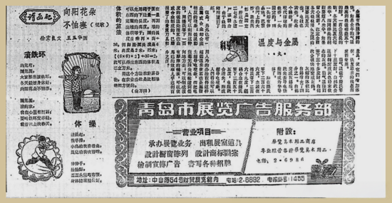 在增加了商业零售的项目后,服务部的名称简化为“青岛市展览广告服务部”。同年的《青岛日报》广告显示,营业项目包括承办展览业务、出租展室道具、设计橱窗陈列、设计商标图案、绘制宣传广告、书写各种招牌。附设的展览美术用品商店,则以“专业经营各种展览美术用品”为主。地址的“中山路54号财贸展览馆内”,说明其时展览馆的建制依旧存在。