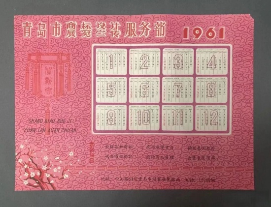 1961年的年历广告,以青岛市商标设计展览宣传服务部为名的机构,仍然是“中山路54号青岛市财贸展览馆内”的单位地址。经营项目,包括设计各种商标、承办展览业务、摄制艺术照片、代办商标登记、设计商品装潢、出售展览用具。