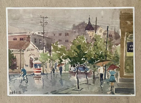 大约四岁的时候,我每天跟随父亲到他的工作单位,中山路54号的美术公司玩耍,从而替代了上幼儿园的时光。有一次,比较清晰地记得是去了火车站以西的一处饭店,感受到书写门头的现场工作。