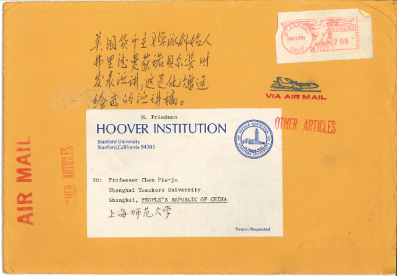 美国货币主义学派创始人米尔顿·弗里德曼(1912-2006)在1981年,将其1976年获得诺贝尔经济学奖时发表演讲的文稿,从他工作的斯坦福大学胡佛研究所寄送给陈彪如。