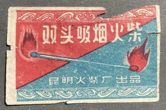 1950年代末,昆明火柴厂曾经推出过一款“双头吸烟火柴”。从尺寸5.3 x 3.4厘米的标贴可以看出,一根擦燃的火柴,是梗枝的两端皆在燃烧的图案示意。这说明火柴梗要两端蘸药,达到一根火柴可擦燃两次的实际使用效果。