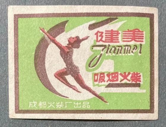 当厂名调整为成都火柴厂时,又出品了一款“吸烟火柴”,但商标确定为“健美”。除了配以汉语拼音的修饰外,核心画面还有一名女子进行体操运动的场景展示。青绿的底色,貌似火苗的图案轮廓,传递出青春的韵律和节奏。