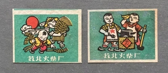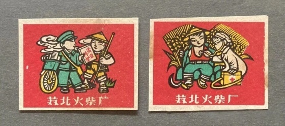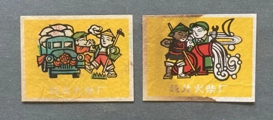 同样,福州火柴厂的标贴也反映相同的政治基调和社会场景。只是标贴上的宣传口号,大部分放在了画面的底部位置。