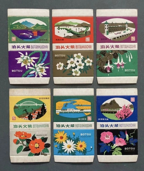 1979年,泊头火柴厂出品了一套“水利·花卉”的火柴。六枚火花的正标,是六处水利工程的图景,背标则是六种不同的花卉相互映衬。