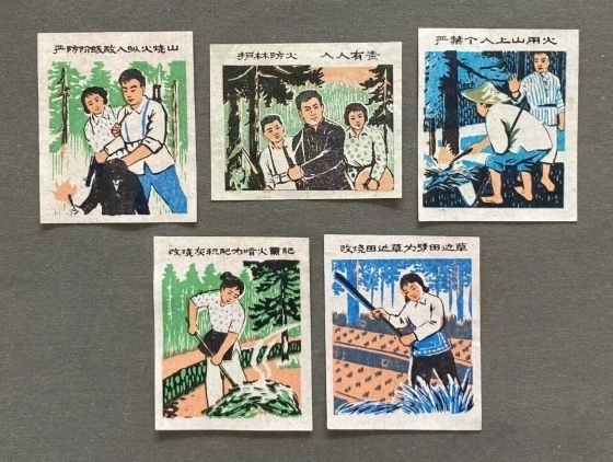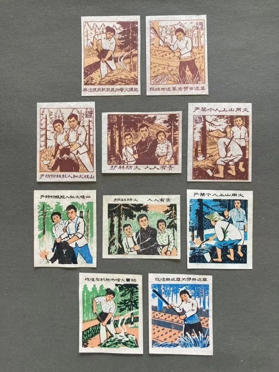 两套火花,各有五枚。尺寸3.4x4.3厘米。两者图案相同,题材一致,即“护林防火,人人有责”。