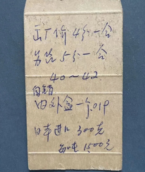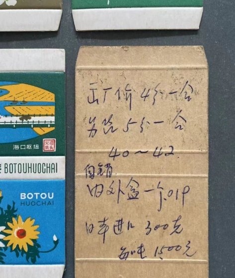 这枚卡标背后的文字,还透露“内外盒一个.019”的线索,基本是0.02元的成本。也就是说,纸质的火柴内外盒占了一半的成本。加之,“日本进口300克”以及“每吨1,500元”的价格提示,泊头火柴的这套卡标,极有可能采用的是进口纸张。