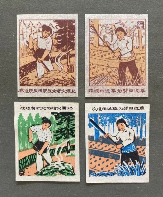 其他的两枚标贴,内容与肥料有关。福州标贴,显示“林边烧灰积肥改为暗火燻肥”。长汀标贴,则是“改烧灰积肥为暗火熏肥”。另外的两枚,两厂的文字都是“改烧田边草为劈田边草”。